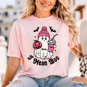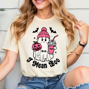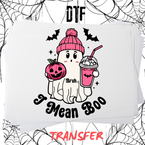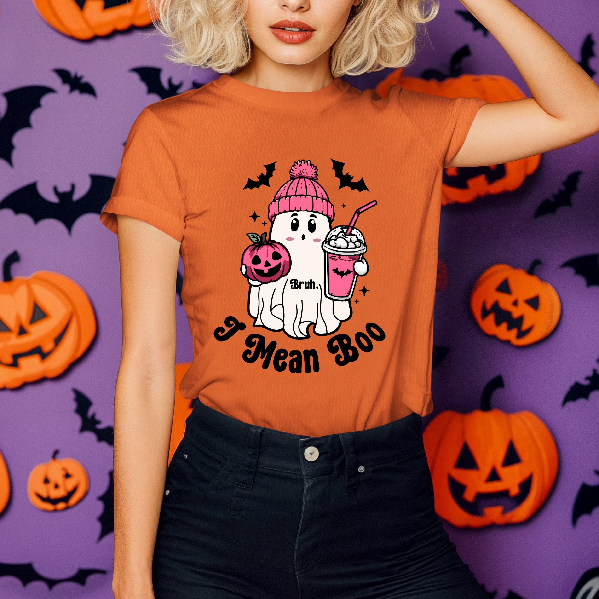 Get ready for Halloween fun with this 'Funny Cute Ghost Bruh I Mean Boo' Pumpkin T-shirt design! This playful design features an adorable ghost saying 'Bruh, I Mean Boo,' perfect for adding humor and charm to your spooky season outfits. Ideal for creating unique Halloween shirts, this DTF transfer is easy to apply and will give your shirts a high-quality, long-lasting print. Whether you're dressing up for a party or just love Halloween, this design is sure to bring smiles and laughter.